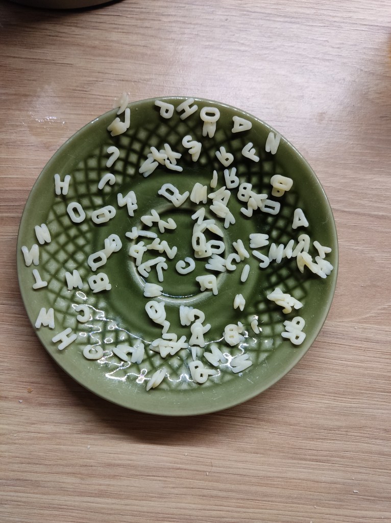 Jakoś przypadkiem i my mamy literki do zupy! Gabi wpadła na pomysł żeby w ten sposób nauczyć Apkę mówić po ludzku. Nie zgodziłam się na zupę, ale taki „suchy” makaron 🤔taka mini odrobinka🤔🤔